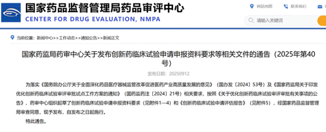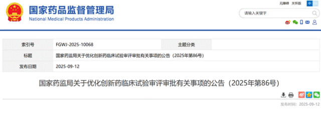 9月12日,国家药监局发布《关于优化创新药临床试验审评审批有关事项的公告》(2025年第86号),明确提出对符合要求的创新药临床试验申请设立“30日审评审批通道”,并于发布之日起正式实施。