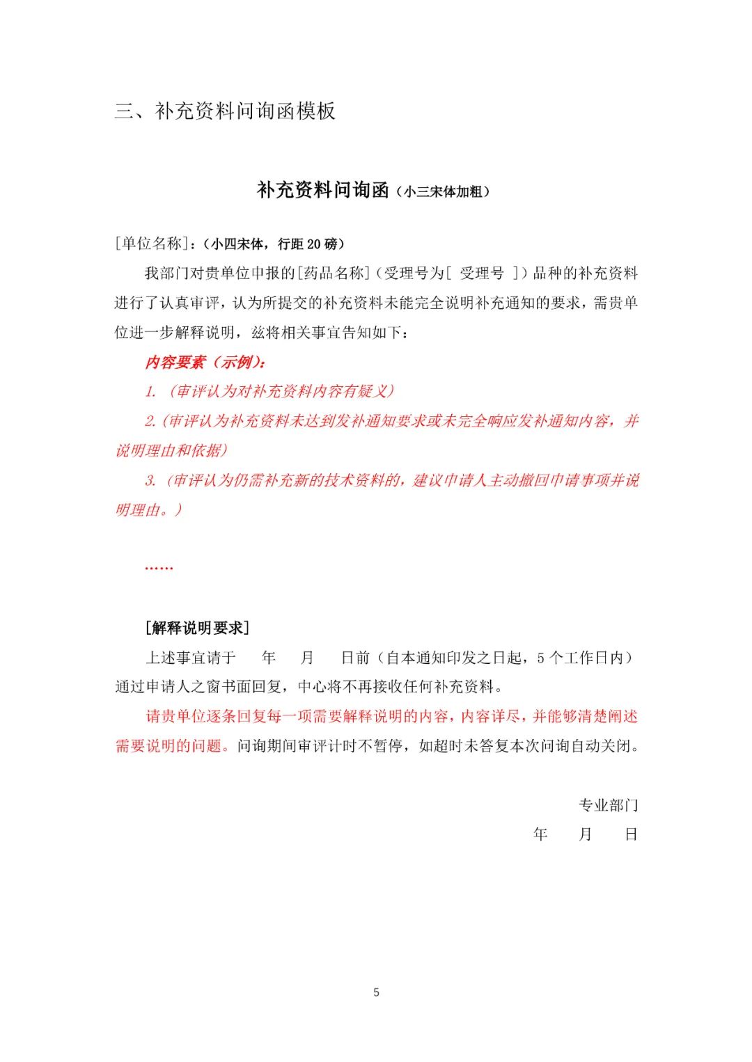 第五条 药审中心在专业审评期间或综合审评期间,专业主审或主审报告人在充分审评基础上对申报资料有疑义或认为内容存在问题,经审评部门负责人审核后,通过药审中心网站向申请人发出“专业审评问询函”,告知申请人存在问题的具体内容、依据和要求等,并要求在5个工作日内进行解释说明或书面回复。