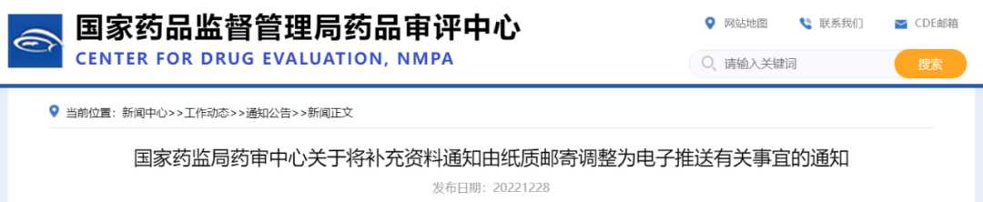 12月28日,CDE发布通知,将补充资料通知由纸质邮寄调整为电子推送。