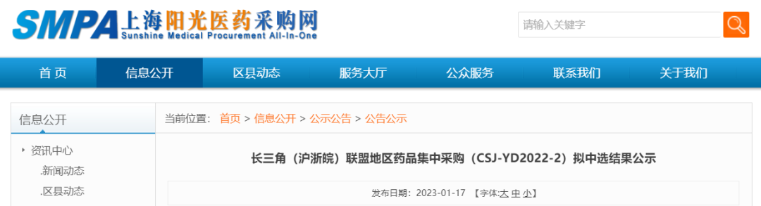 1月17日,长三角(沪浙皖)联盟采购工作组发布通知,对长三角(沪浙皖)联盟地区药品集中采购拟中选结果进行公示。公示时间:2023年1月17日至2023年1月19日。