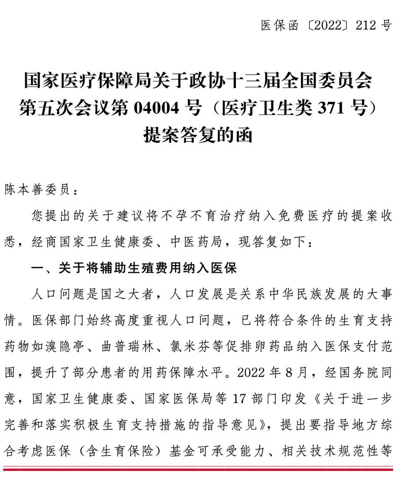 国家医保局在回复中表示,目前已将符合条件的生育支持药物,如溴隐亭、曲普瑞林、氯米芬等促排卵药品纳入医保支付范围,提升了部分患者的用药保障水平。