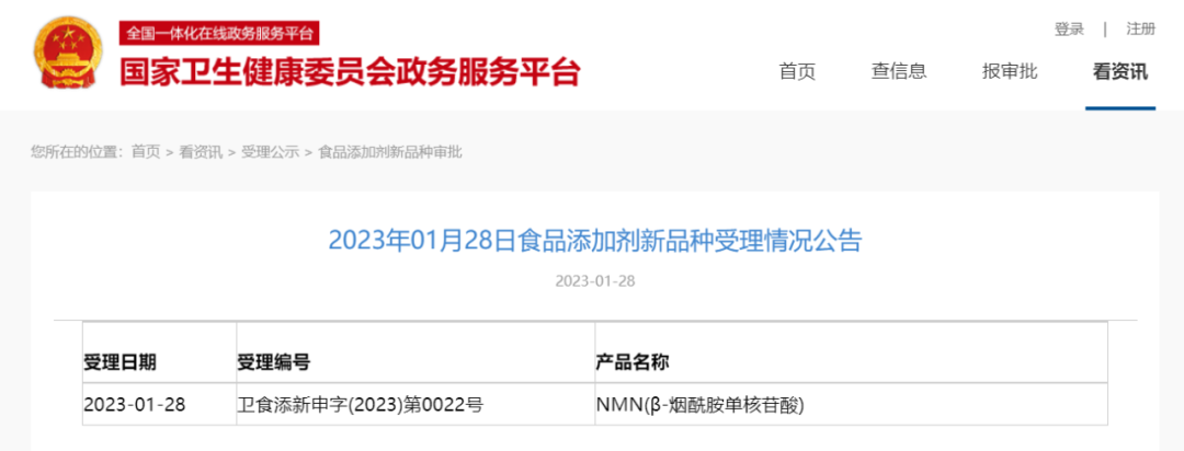 近日,国家卫健委发布公告,已受理NMN(β-烟酰胺单核苷酸)为食品添加剂新品种的申请。