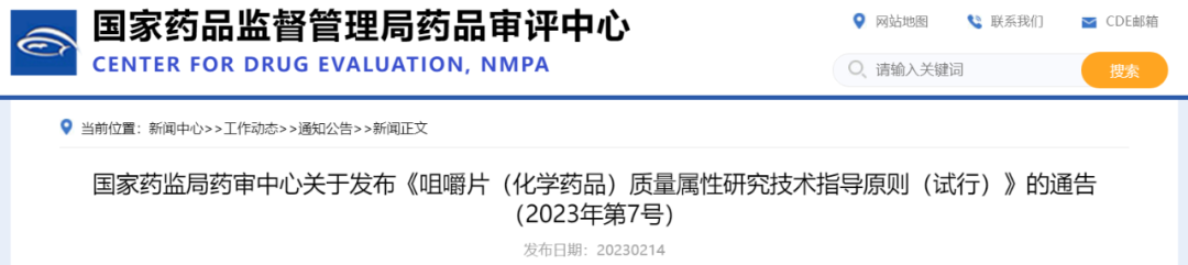 为了规范和指导咀嚼片(化学药品)质量属性的研究,提供可参考的技术标准,在国家药品监督管理局的部署下,药审中心组织制定了《咀嚼片(化学药品)质量属性研究技术指导原则(试行)》(见附件)。