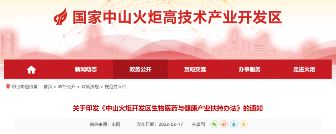 3月17日,国家中山火炬高技术产业开发区印发《中山火炬开发区生物医药与健康产业扶持办法》。本办法自2023年1月1日起施行,有效期3年。