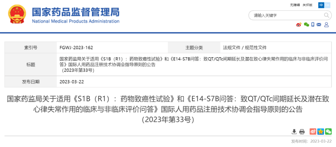 3月22日,国家药监局发布通知,决定适用《S1B(R1):药物致癌性试验》、《E14-S7B问答:致QT/QTc间期延长及潜在致心律失常作用的临床与非临床评价问答》国际人用药品注册技术协调会指导原则。