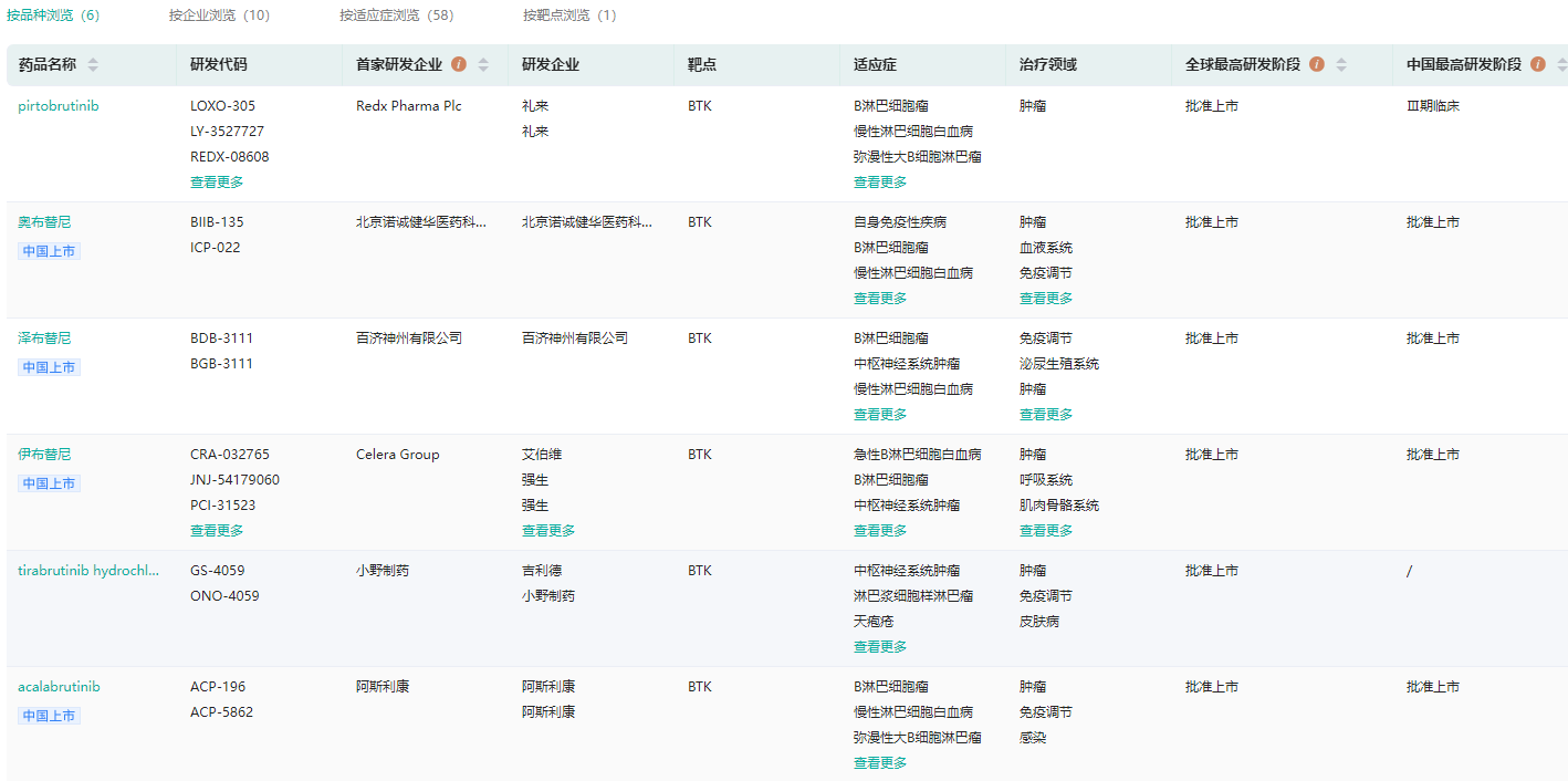 药融云数据库显示,截止目前,全球已有6款BTK抑制剂上市,分别是2013年获批的伊布替尼、2017年获批的阿卡替尼、2019年上市的泽布替尼、2020年上市的替拉鲁替尼和奥布替尼,2023年上市的pirtobrutinib。其中,强生的伊布替尼、百济神州的泽布替尼、诺诚健华的奥布替尼、阿斯利康的阿卡替尼已在中国上市。