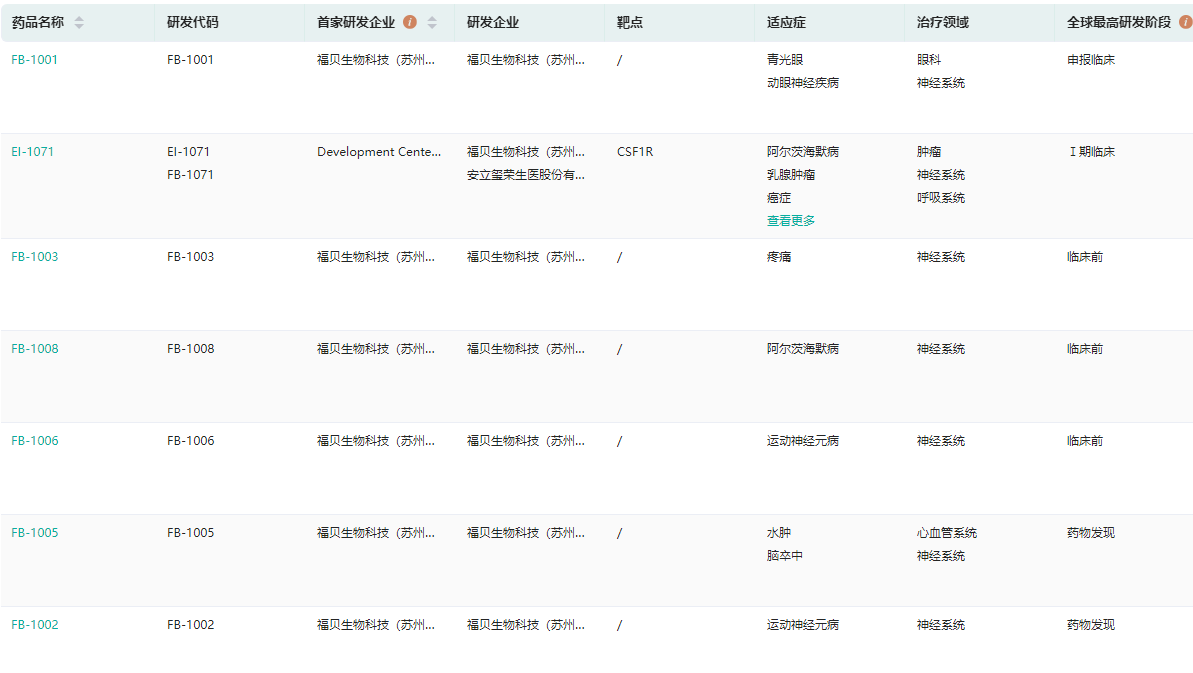 药融云全球药物研发数据库显示,截至目前,福贝生物有8个临床前和临床阶段项目,进度最快的是EI-1071,处于I期临床研发阶段。EI-1071是一款CSF1R抑制剂,可以高亲和力和选择性地抑制和杀伤神经系统中的小胶质细胞,有效地阻断驱动疾病发展的神经炎症反应,减缓神经损伤,帮助神经细胞修复,具备治疗脑卒中、渐冻症、阿尔茨海默症等多种神经系统疾病的潜力。