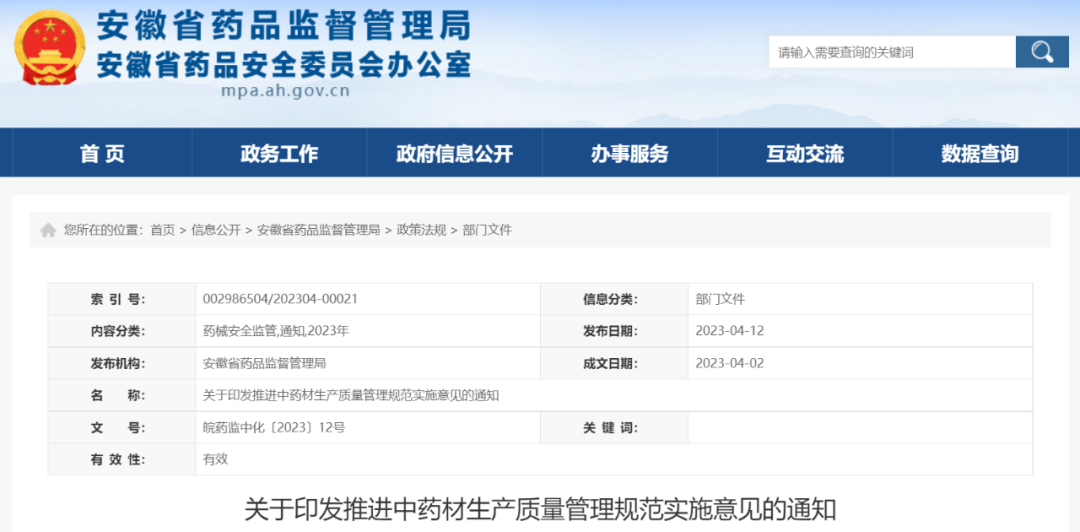 近日,安徽省药监局发布《推进中药材生产质量管理规范实施意见》,以促进中药材规范化生产,从源头提升中药质量,促进中药传承创新发展。