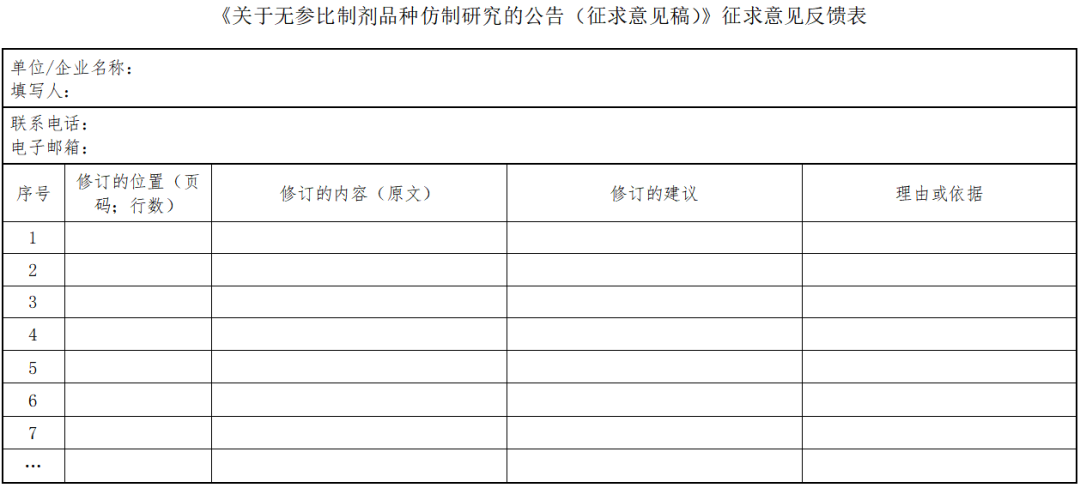 3. 《关于无参比制剂品种仿制研究的公告(征求意见稿)》征求意见反馈表
