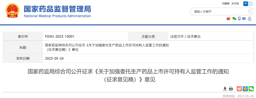 5月24日,国家药监局综合司公开征求《关于加强委托生产药品上市许可持有人监管工作的通知(征求意见稿)》意见。