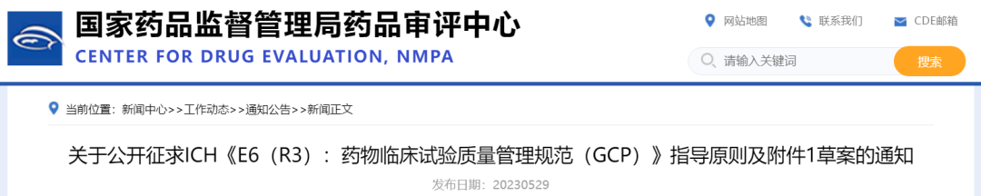 5月29日,CDE发布通知,公开征求ICH《E6(R3):药物临床试验质量管理规范(GCP)》指导原则及附件1草案。
