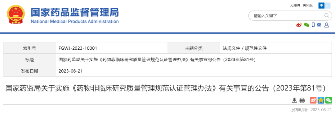 6月21日,国家药监局发布公告,《药物非临床研究质量管理规范认证管理办法》将于7月1日起施行。