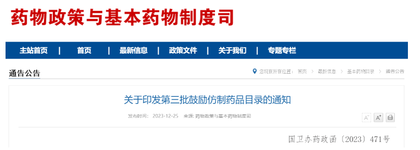 12月25日,国家卫生健康委联合工业和信息化部、国家知识产权局、国家医保局、国家疾控局、国家药监局等部门组织专家对国内专利即将到期及临床供应短缺(竞争不充分)的药品进行遴选论证,制定了《第三批鼓励仿制药品目录》。