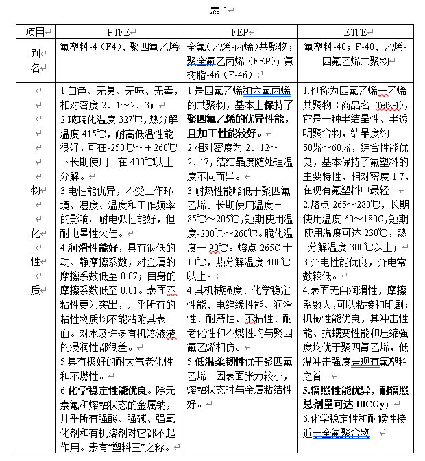 目前,注射剂用覆膜胶塞使用的含氟膜材主要有PTFE、FEP和ETFE,其性能如表1。