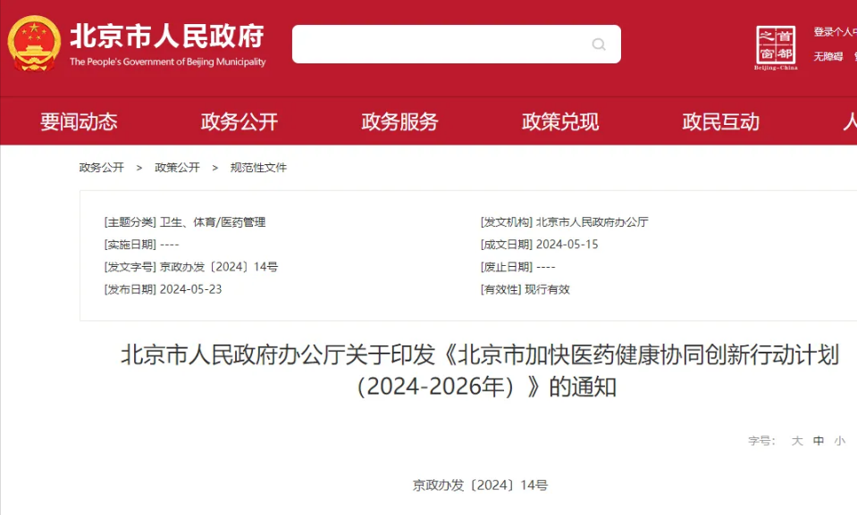 北京市加快医药健康协同创新行动计划(2024-2026年)