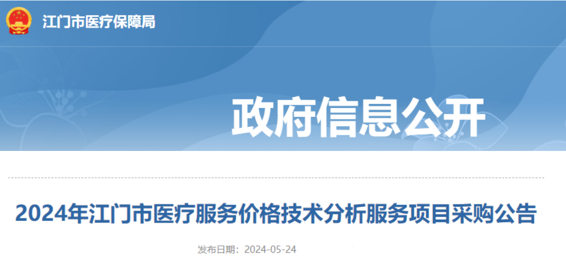 5月24日,广东江门市医保局发布了采购公告,招募第三方机构开展2024年江门市医疗服务价格技术分析服务。根据公告内容,此次服务的重点内容便包括协助开展大型设备检查项目和医疗机构反馈价格不合理项目的价格成本调查、专项治理等工作。服务期限为从签订协议之日起12个月,为期一年。