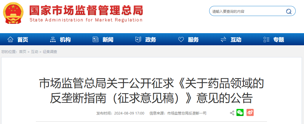 2024年8月9日,市场监管总局发布《关于药品领域的反垄断指南(征求意见稿)》(下称“指南”)。指南共7章55条,覆盖中药、化学药和生物制品等全药品领域的生产、经营行为。意见反馈截止日期为2024年8月23日。
