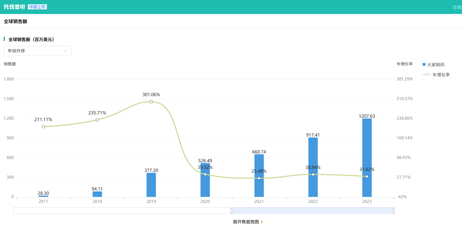据摩熵医药数据库显示,该药于2022年3月在日本获批上市,用于其他利尿剂(如袢利尿剂)不足以控制的心力衰竭中体液潴留。2025年9月,原研药进入中国市场。在全球市场,托伐普坦的市场成绩斐然——2023年销售额超12亿美元,同比增长率达31.62%!