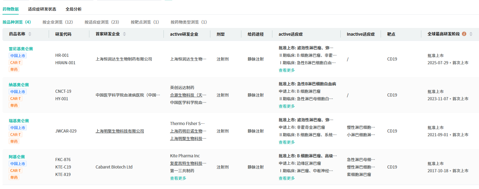 据摩熵医药数据库显示,普基奥仑赛是国内第5款获批上市的CD19 CAR-T疗法,此前获批上市的疗法分别是:阿基仑赛(复星凯特/吉利德)、瑞基奥仑赛(药明巨诺)、纳基奥仑赛(合源生物)、雷尼基奥仑赛(恒润达生)。
