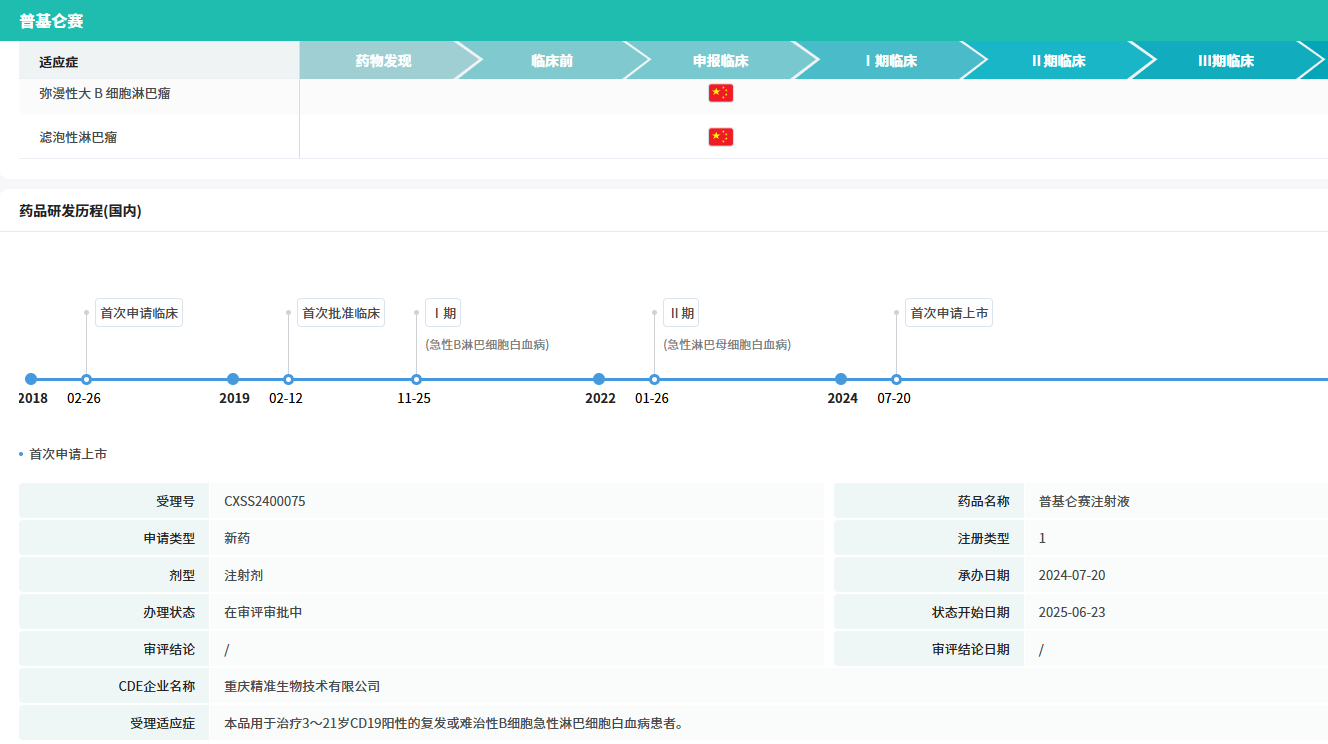 11月7日,据NMPA发布公告,通过优先审评审批程序附条件批准重庆精准生物申报的普基奥仑赛注射液(商品名:普利得凯)上市,用于治疗3~21岁CD19阳性的难治或复发(首次缓解12个月后复发需经挽救化疗)的急性B淋巴细胞白血病患者。
