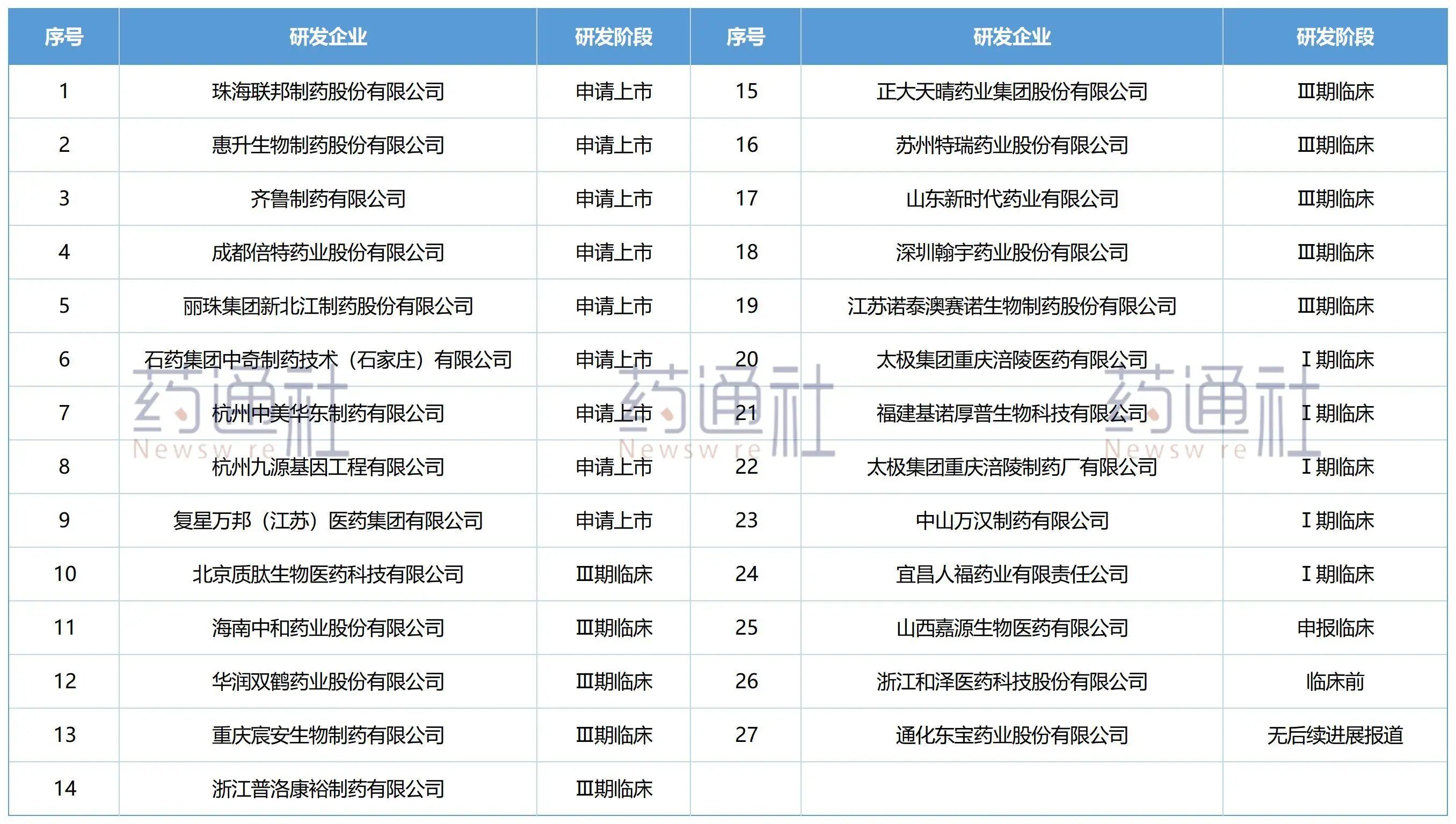 当然相比新药,国内对已明确能减重的GLP-1药物的生物类似药抢占更加疯狂。其中,最卷的竞争仍集中于司美格鲁肽,如上文所说,国内已有27家申报临床或上市,司美格鲁肽首仿暂未获批,大家都想抢第一梯队。