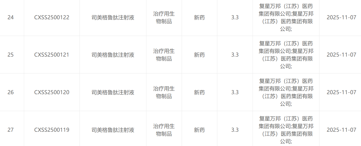 11月7日,复星万邦医药有限公司的司美格鲁肽注射液3.3类上市申请获受理,成为国产第9家申报司美格鲁肽上市的企业。