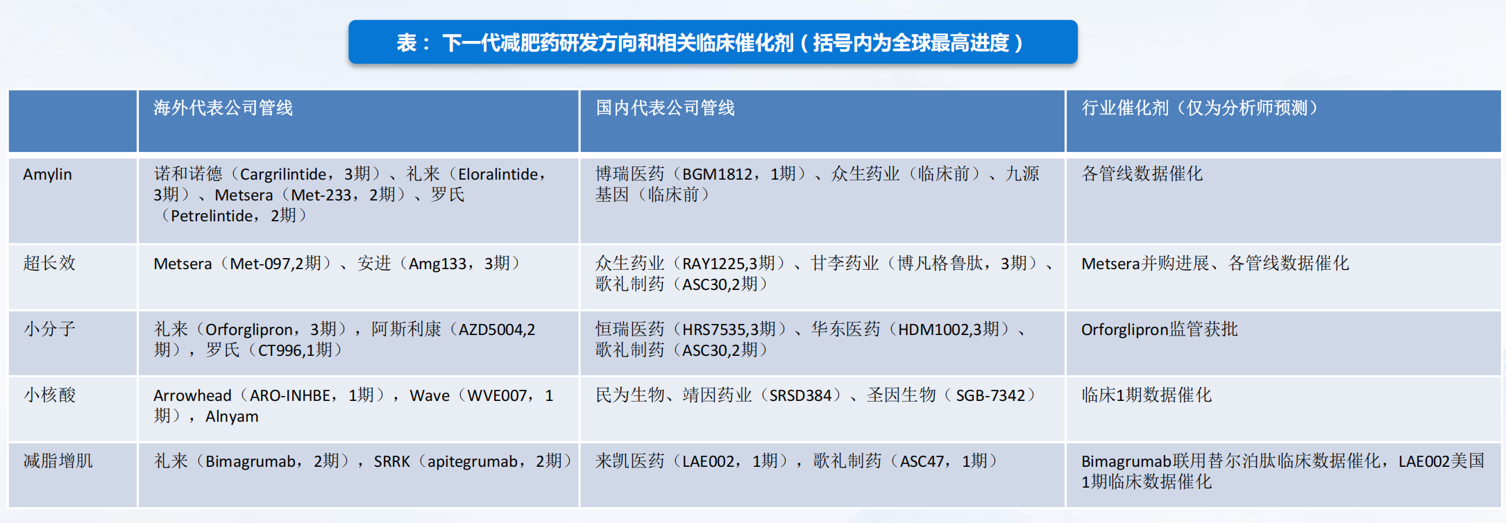不止是GLP-1,各类减肥药物都处于极度竞争状态,目前全球的减肥药之争已经进入下一代,几种最热门的研发方向:Amylin、超长效、小分子、小核酸等,国内企业研发进度也均位于前列。