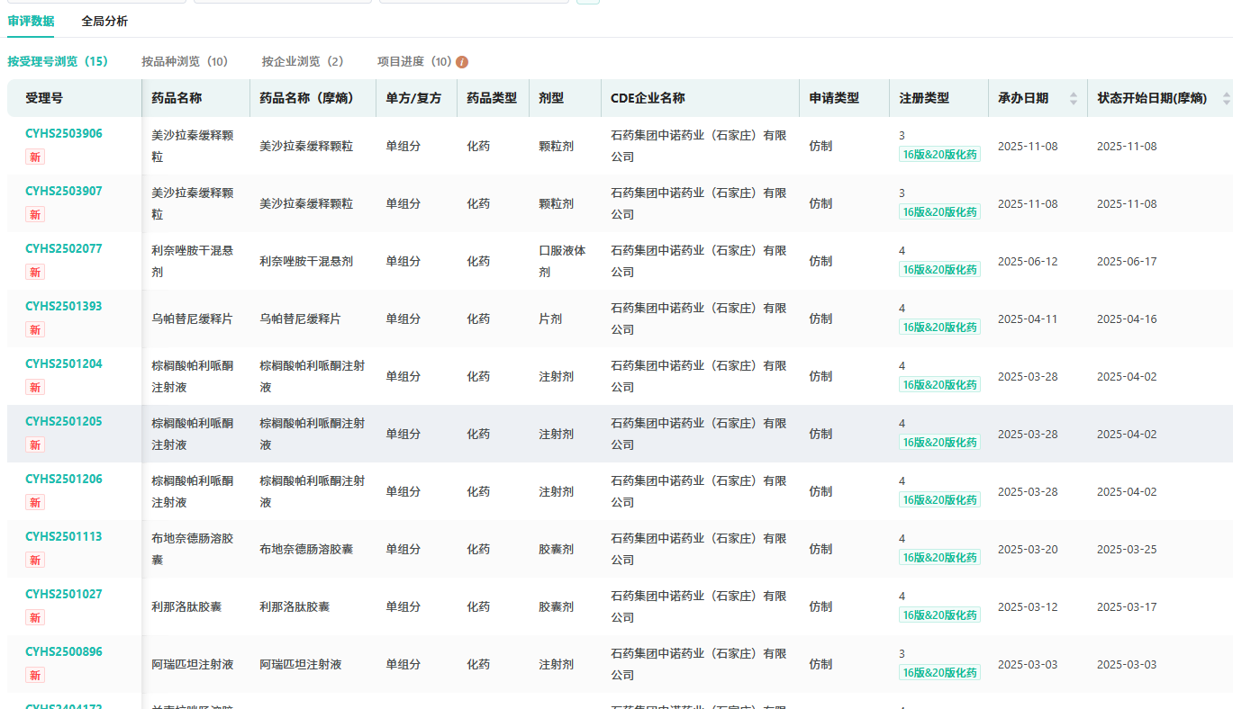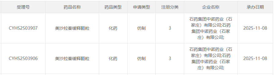 近日,据CDE官网公示,石药集团中诺药业(石家庄)按化药注册分类3类申报的美沙拉秦缓释颗粒上市申请获受理。截至目前,石药集团有10款产品报产在审。