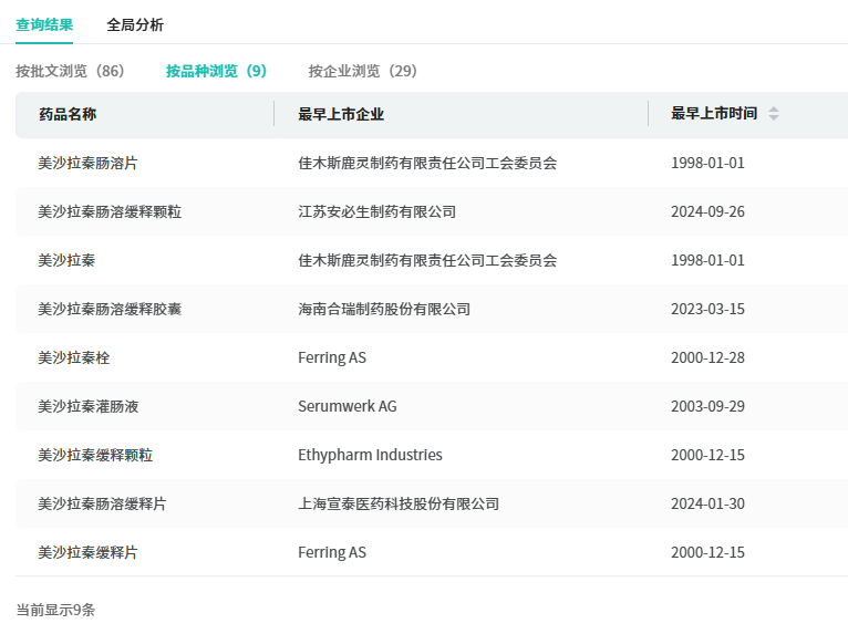 目前,国内市场上已有多种美沙拉秦制剂,包括肠溶片、缓释颗粒、缓释胶囊、缓释片、灌肠液及栓剂6款产品获批,企业竞争未算十分激烈。