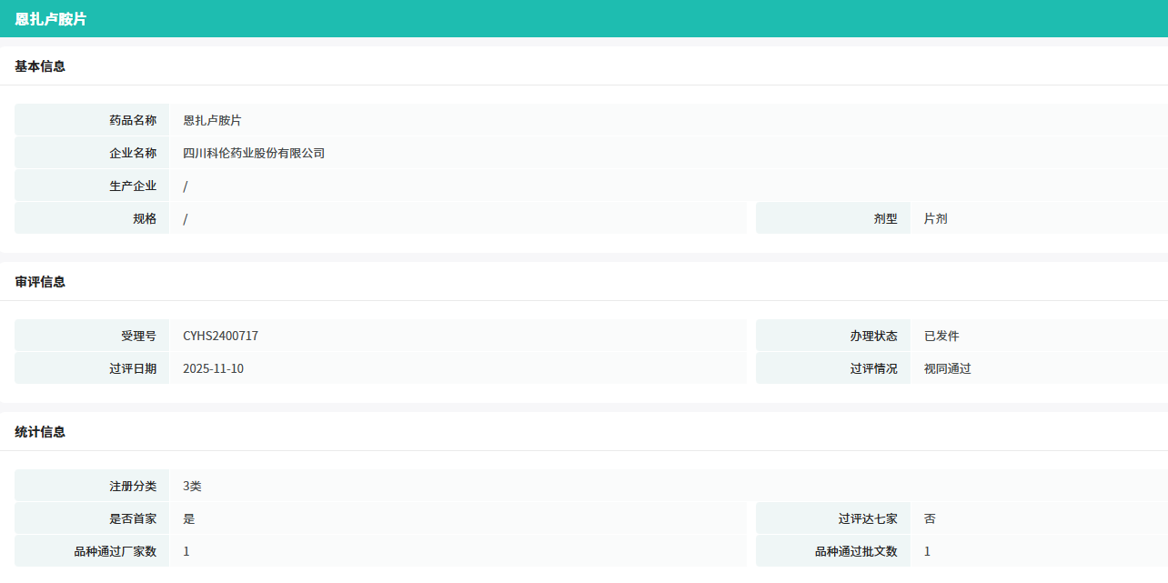 11月10日,据NMPA官网显示,科伦药业提交的3类注册仿制药恩扎卢胺片获批上市并视同通过一致性评价,成为国内首个获批的恩扎卢胺片仿制药企。