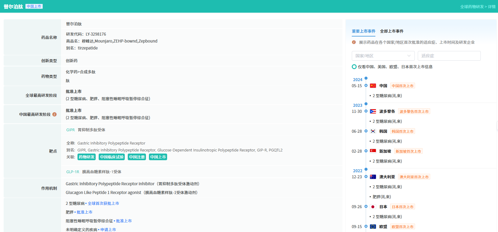 替尔泊肽是一款 GLP-1R/GIPR 双重激动剂,2022年5月,替尔泊肽首次获FDA批准上市,用于治疗2型糖尿病。2024年5月,替尔泊肽首次在我国获批上市,用于在饮食控制和运动基础上,接受二甲双胍和/或磺脲类药物治疗血糖仍控制不佳的成人2型糖尿病(T2DM)患者。
