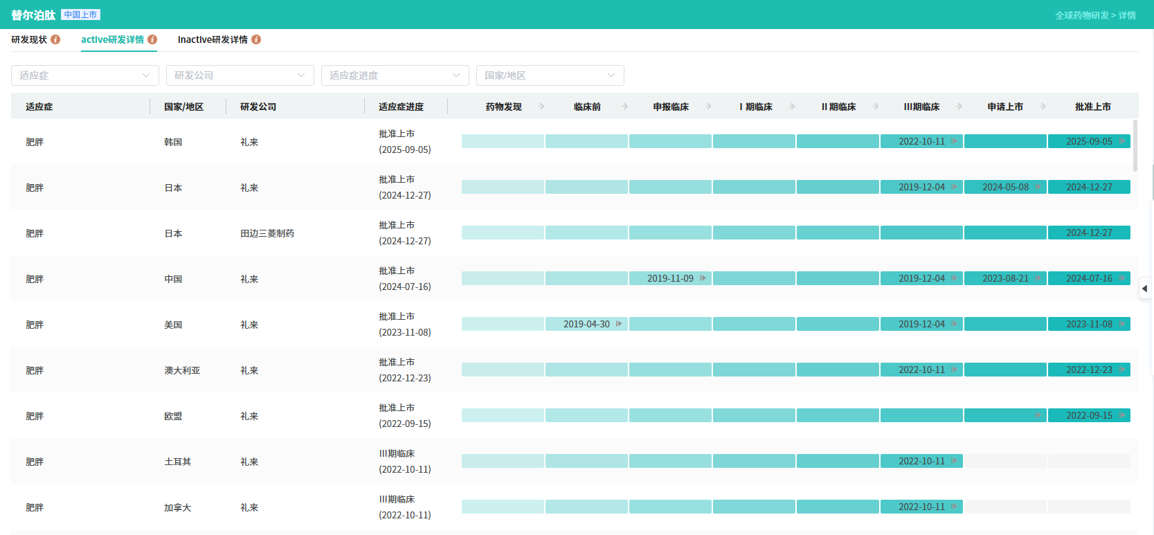 据摩熵医药数据库显示,替尔泊肽针对合并肥胖的射血分数保留性心力衰竭患者的III期临床研究(CTR20211863)也已于2024年完成。2024年11月,替尔泊肽注射液还在华申报了一项新适应症上市申请。