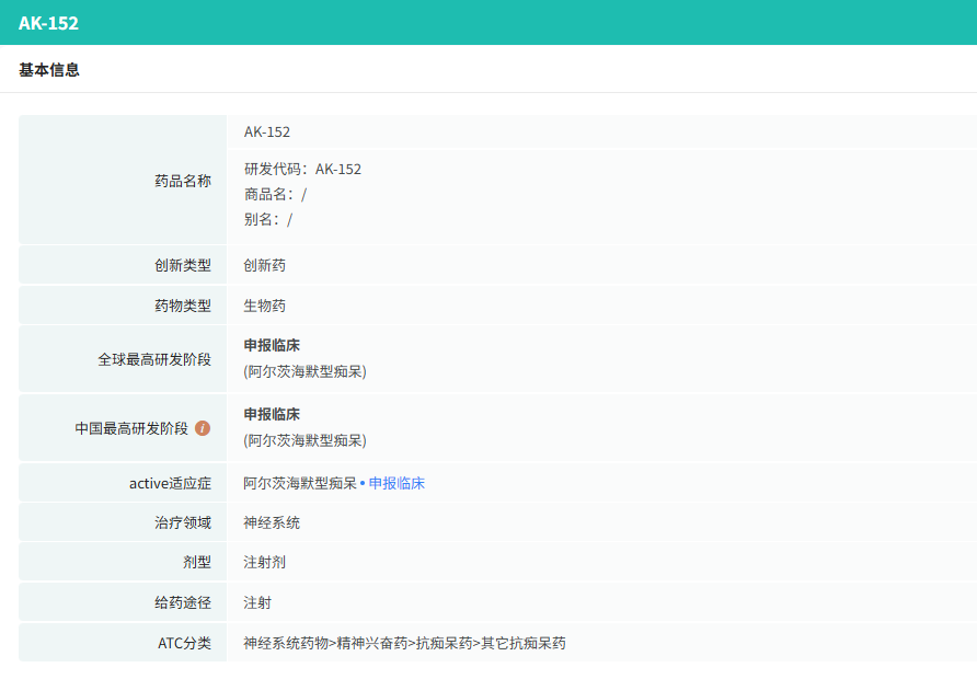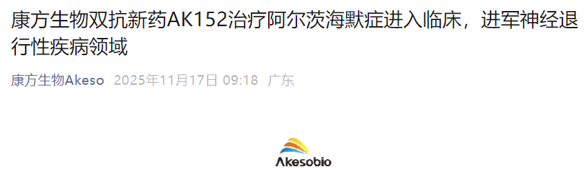 11月17日,康方生物宣布,其自主研发的协同靶向Aβ和BBB高表达受体的双特异性抗体新药 AK152 ,已正式获得国家药品监督管理局批准,开展用于治疗阿尔茨海默症(AD)的临床试验。据康方生物新闻稿披露, AK152 是中国首个用于阿尔茨海默症疾病修饰治疗的双特异性抗体新药。