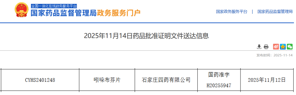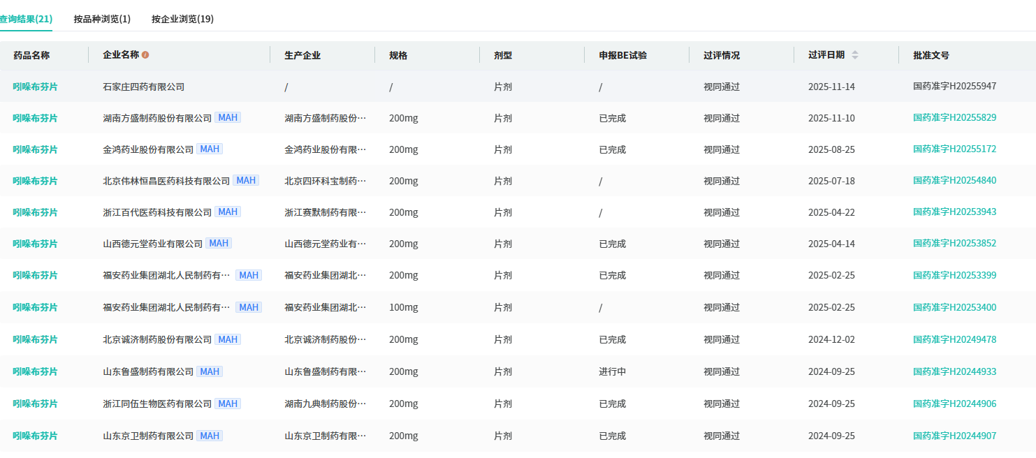 11月14日,据NMPA官网显示,石家庄四药申报的化学药品第3类 吲哚布芬片(0.2g)获批上市并视同过评。截至目前,该品种在国内有19家药企获批并视同过评。