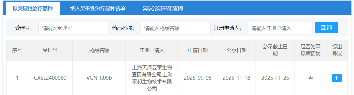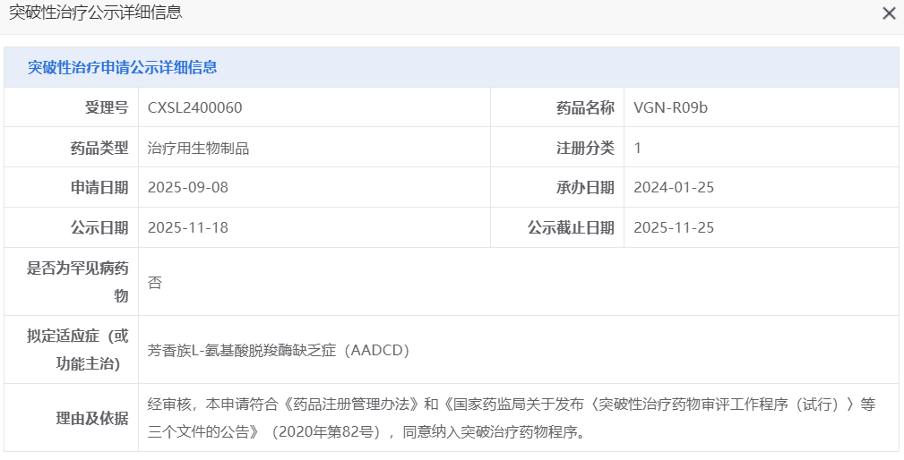 11月18日,CDE官网显示,上海天泽云泰生物的基因治疗药物 VGN-R09b 拟纳入突破性治疗品种,适应症为:芳香族L-氨基酸脱羧酶缺乏症(AADCD)。