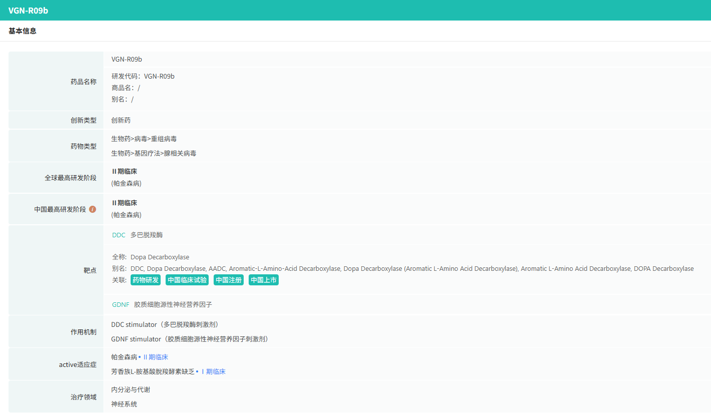 VGN-R09b是全球首个中、美同步获批临床,也是全球首创双靶点治疗帕金森病的重组腺相关病毒类基因治疗产品,目前处于1/2期临床阶段,也是我国最早进入注册临床阶段的用于治疗帕金森病的基因治疗药物。