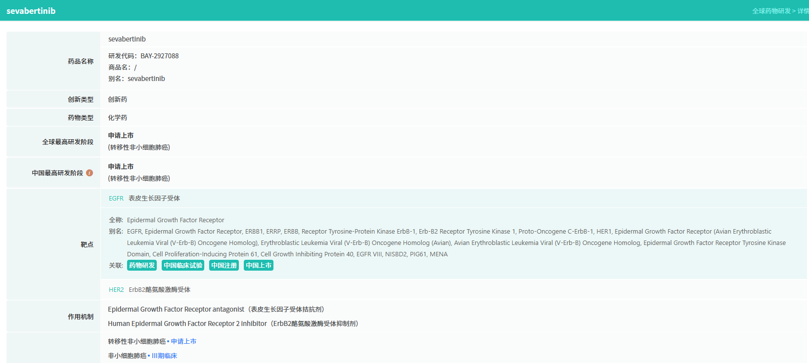 Sevabertinib 是拜耳开发的一款口服非共价可逆选择性酪氨酸激酶抑制剂,对携带EGFR和HER2突变(包括HER2 exon 20插入突变)的肿瘤有抑制活性。FDA此次批准主要是基于I/II期SOHO-01研究的积极结果。