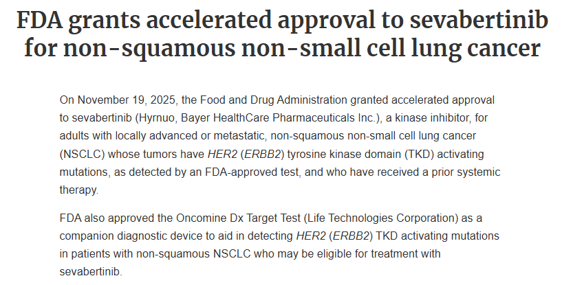 11月19日,FDA官网显示,拜耳的肺癌新药 Sevabertinib(BAY 2927088)获批上市,用于治疗经FDA批准的伴随诊断设备证明肿瘤携带HER2(ERBB2)酪氨酸激酶结构域(TKD)激活突变并且接受过系统治疗的局部晚期或转移性非鳞状非小细胞肺癌(nsq-NSCLC)成人患者。此外,FDA批准了Life Technologies Corporation开发的Oncomine Dx Target Test作为伴随诊断设备。