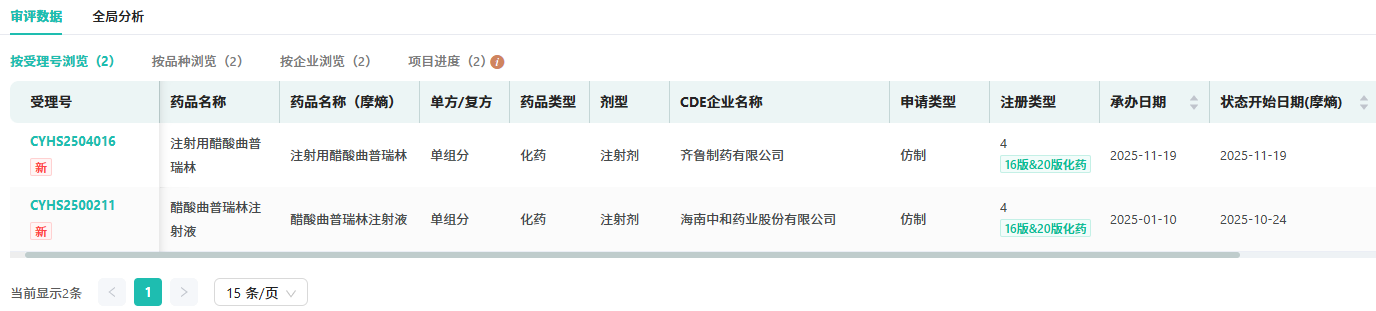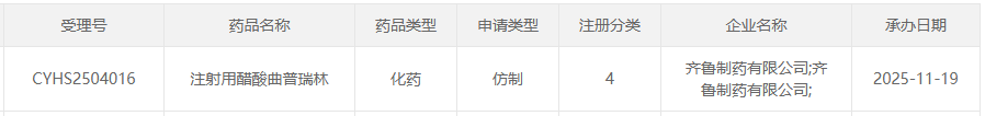 11月18日,据CDE官网显示,齐鲁制药以4类仿制药申报的注射用醋酸曲普瑞林上市申请获受理。摩熵医药数据库显示,这是继丽珠、长春金赛药业后,又一本土巨头入局,国产曲普瑞林市场竞争加剧。