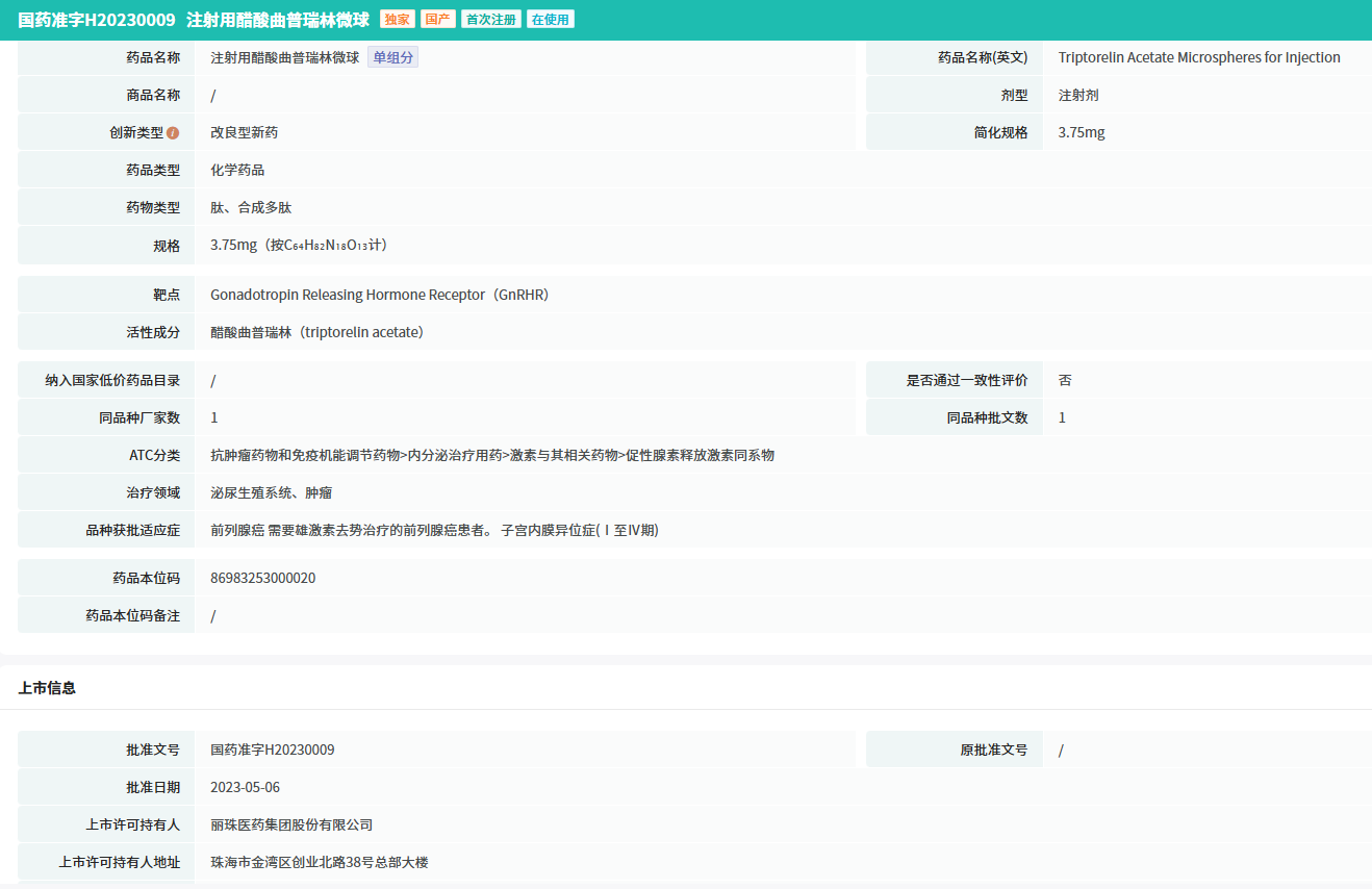 曲普瑞林(Triptorelin)是天然促性腺激素释放激素类似物。醋酸曲普瑞林注射液 由Debiopharm最早研制,1995年获我国批准;其微球制剂2000年由法国益普生引入中国,后长期被益普生和德国辉凌垄断。