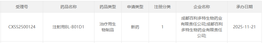 11月21日,CDE官网显示,百利天恒的注射用BL-B01D1上市申请获受理。根据招股书和临床试验进展,用于治疗鼻咽癌。此前,该适应症已被药监局纳入优先审评。