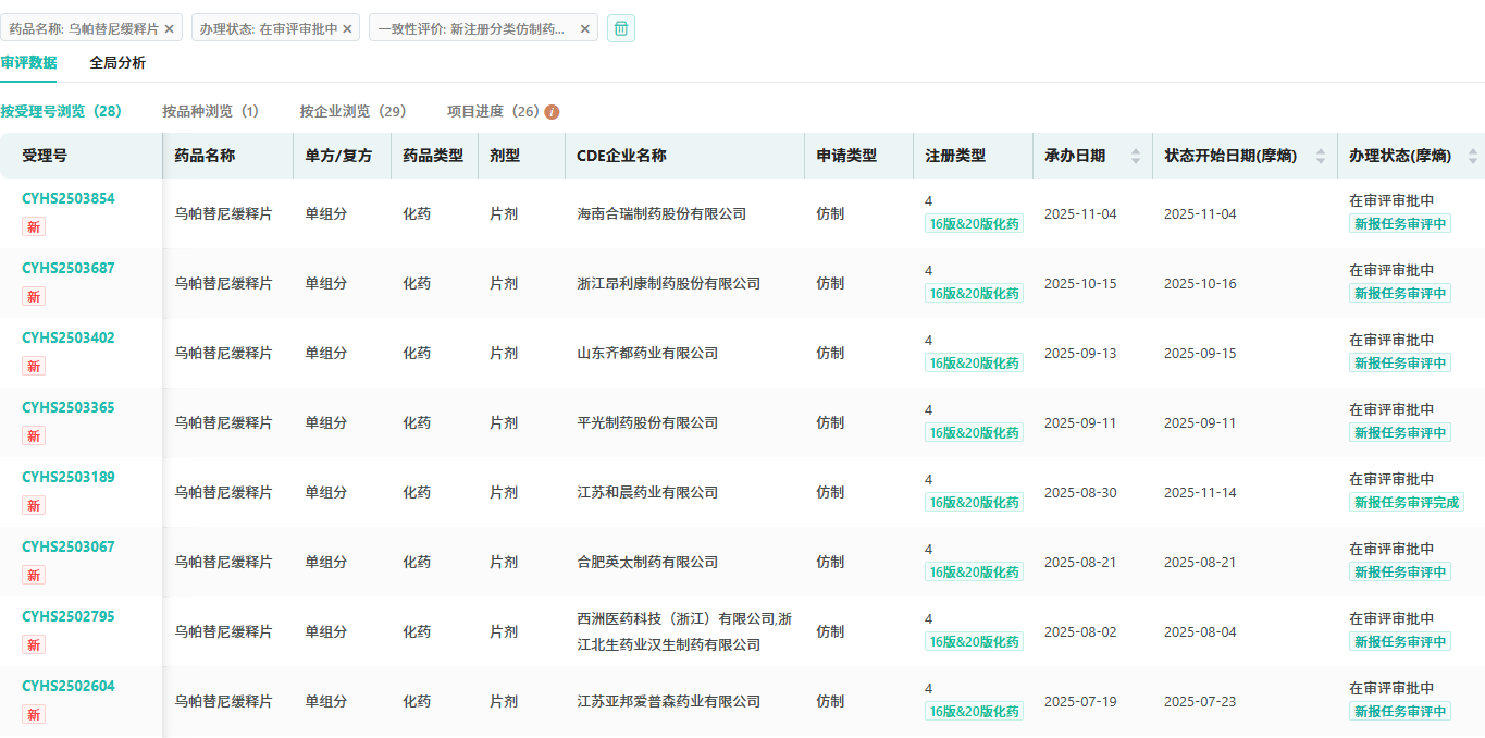 乌帕替尼自上市以来,便遭到国内仿制企业的“围剿”,专利无效诉讼案件频发,首仿竞争异常激烈。国内大批仿制药已经在路上,目前有超25家仿制药企提交了4类新注册的上市申请,均在审评审批中。可以预见,扎堆获批不过早晚之事。而在这场激烈的角逐中,若九华华源药业和华益药业能突出重围、顺利获批,将有望拿下乌帕替尼缓释片的国内首仿。
