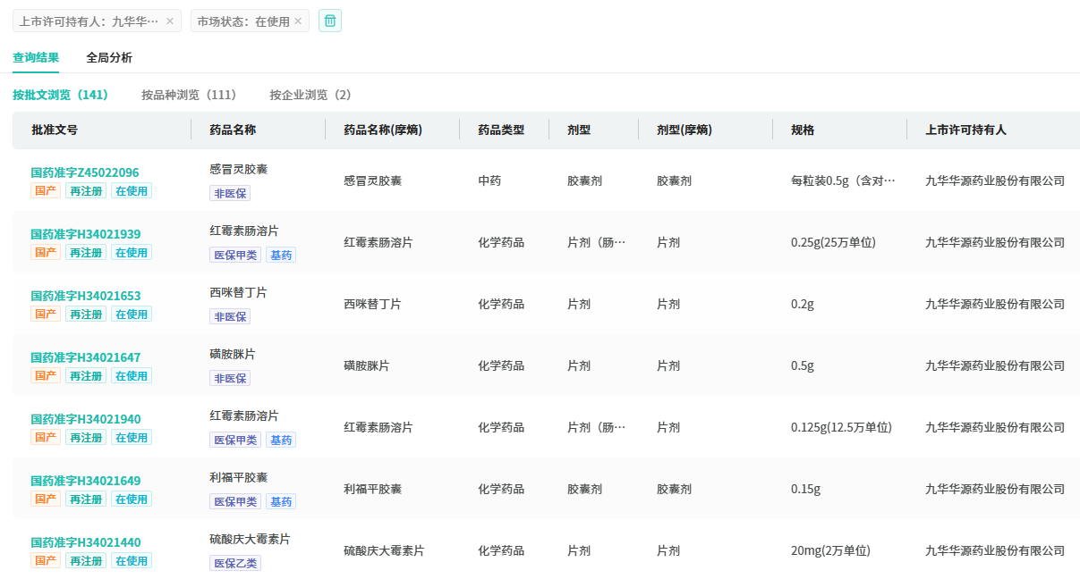 截至目前,九华华源药业有超100款品种获批上市,其中玉叶金花清热片、百蕊颗粒、玉叶清火片、厌食康颗粒4款为独家中成药。目前公司仅有口服补液盐散(Ⅲ)1款仿制药获批并视同过评。