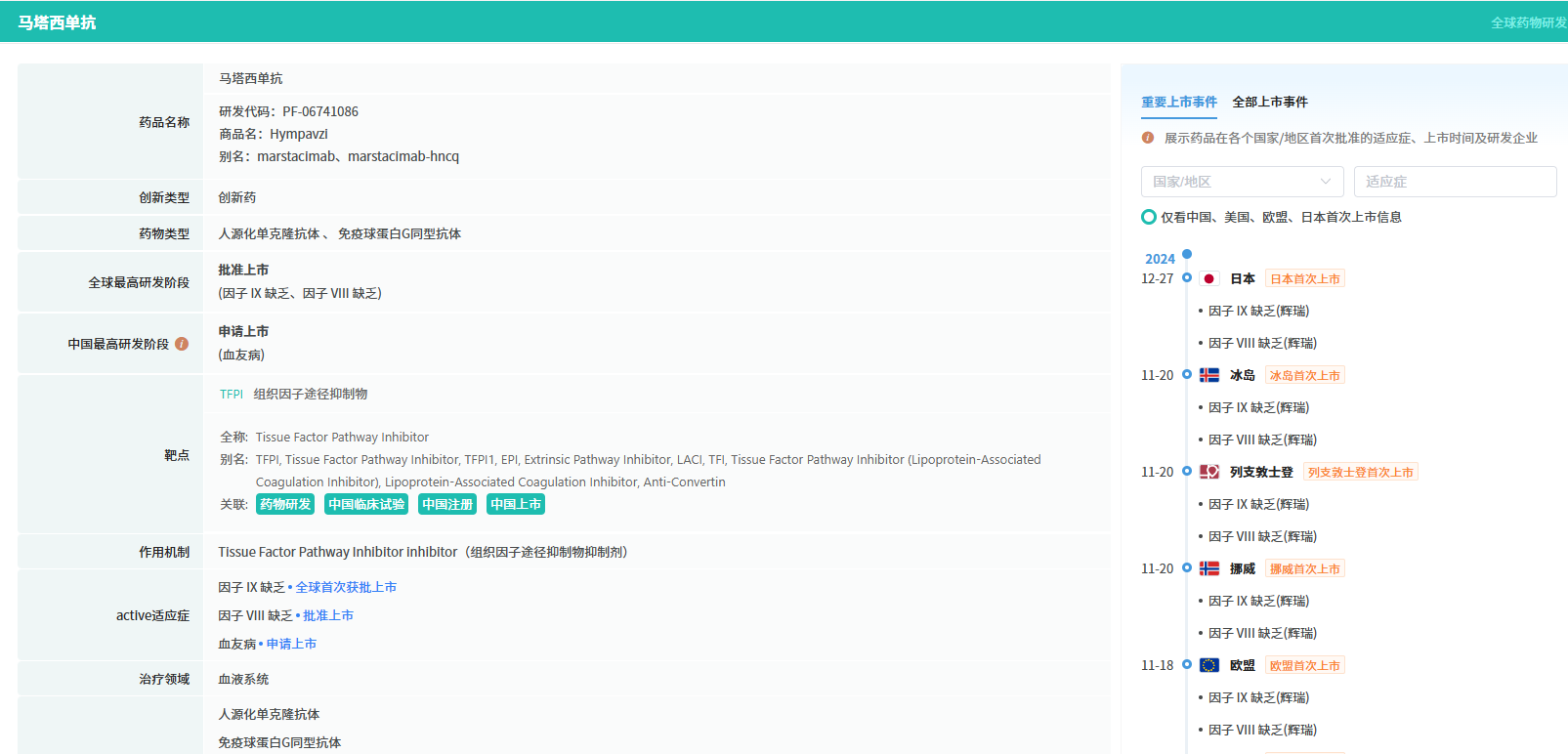 马塔西单抗是辉瑞开发的一种靶向组织因子途径抑制物(TFPI)K2 结构域的单克隆抗体,属于血友病再平衡疗法。TFPI 是一种天然抗凝蛋白,具有防止血栓形成和恢复止血的功能。