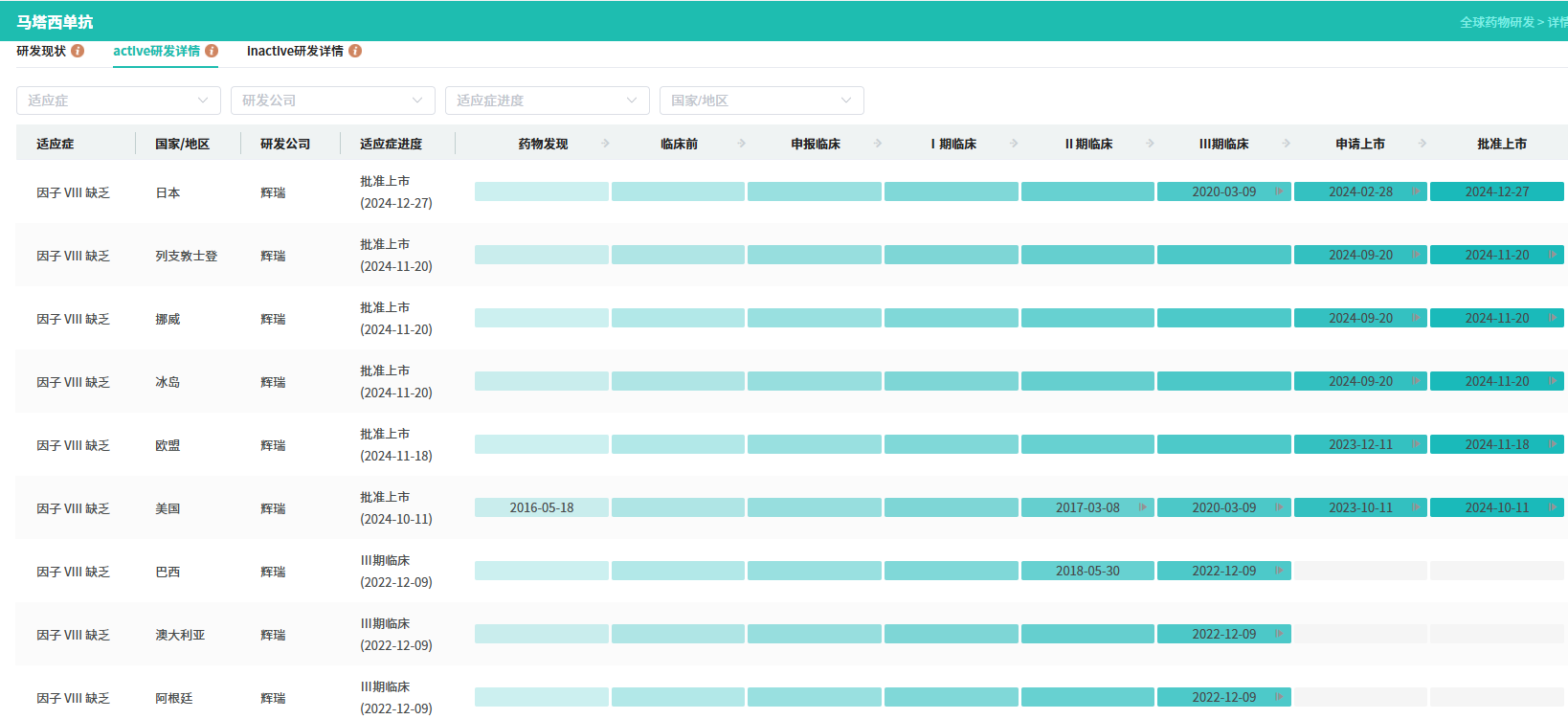 据摩熵医药数据库显示,该药已于2024年 10月、11月、12月陆续在美国、欧盟和日本获批上市。获批适应症为:用于规律性治疗患有不伴凝血因子抑制物的重型血友病 A(先天性凝血 VIII 因子缺乏症,FVIII<1%)或者重型血友病 B(先天性凝血 IX 因子缺乏症,FIX<1%)的12岁及以上且体重不低于35公斤的患者,以减少出血的发作。