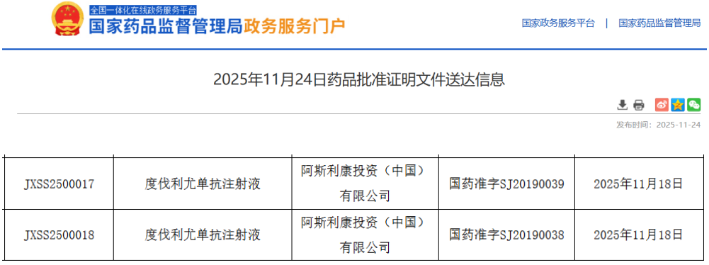 11月24日,据NMPA官网显示,阿斯利康的度伐利尤单抗注射液又一新适应症在国内获批上市。根据阿斯利康公开资料及该药本次国内申请的注册分类(2.2 类),本次获批的适应症为局部晚期非小细胞肺癌(NSCLC)。