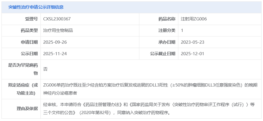 2025年7月,CDE已授予 ZG006 突破性治疗,用于单药治疗复发或进展的晚期小细胞肺癌患者。