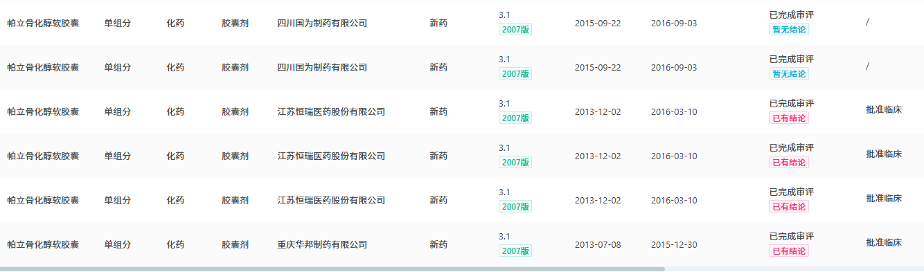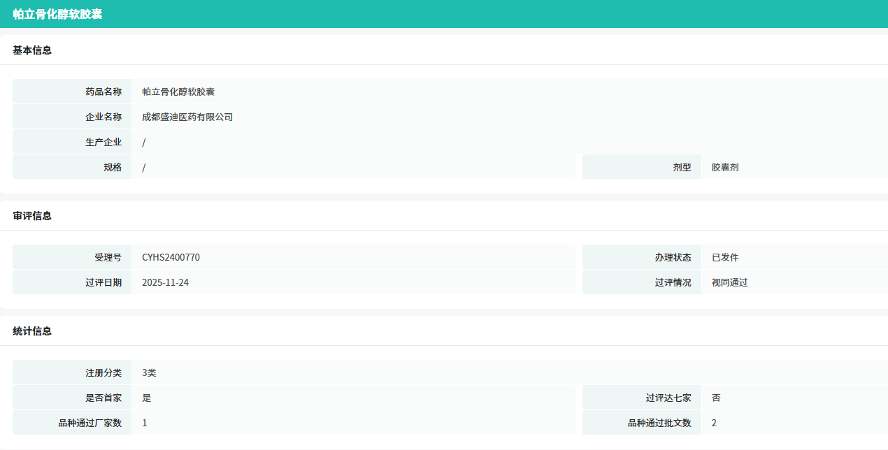 11月24日,据NMPA官网显示,恒瑞子公司成都盛迪医药申报的3类仿制药帕立骨化醇软胶囊获批上市并视同过评。截止目前,该品种在国内暂无药企获批上市。