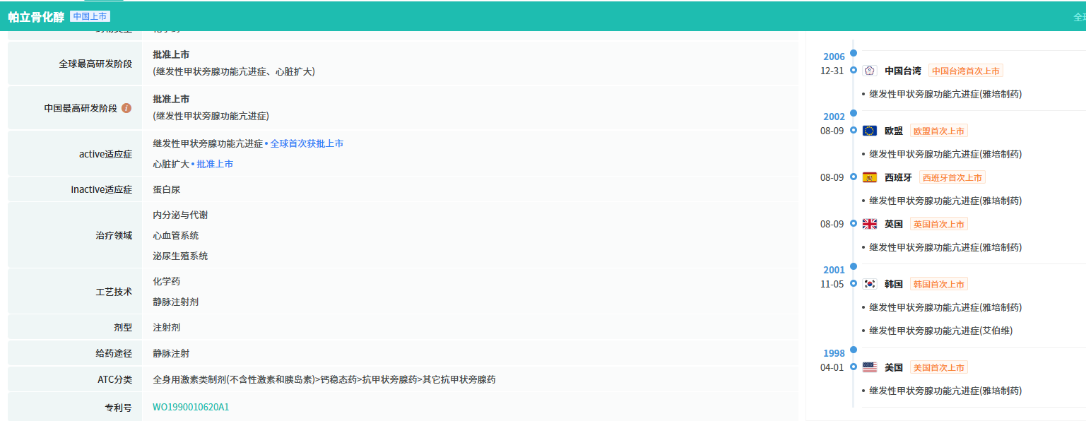 帕立骨化醇是Abbvie公司开发的活性维生素D类似物,用于治疗接受血液透析的慢性肾功能衰竭患者的继发性甲状旁腺功能亢进。帕立骨化醇主要有注射液和胶囊剂两种剂型,其中帕立骨化醇注射液最早于1998年4月17日获得FDA批准。