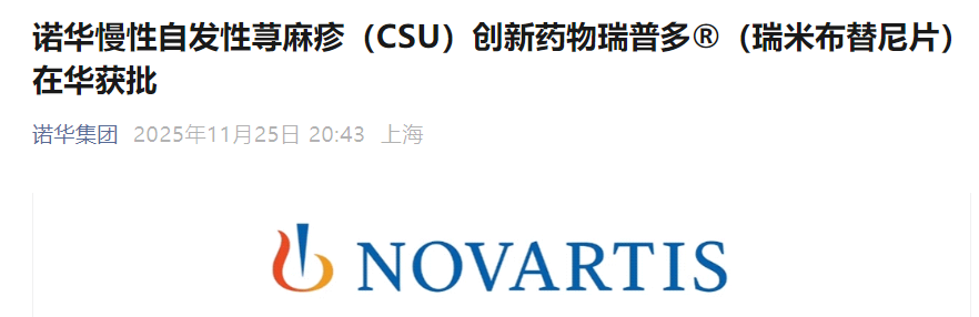 11月25日晚,诺华宣布,旗下创新药物 瑞普多®(瑞米布替尼片)获得国家药品监督管理局批准,适用于H1抗组胺药控制不充分的成人慢性自发性荨麻疹患者。
